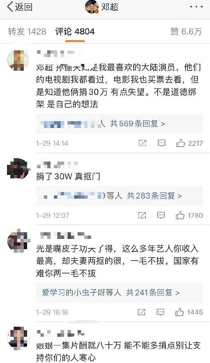 鄧超孫儷夫婦捐款30萬,被網友罵。黃曉明楊穎夫婦捐款20萬也被罵,最後還補捐了80萬。
