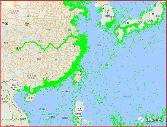 不僅如此,這裏空間狹小,到處是漁船商船,甚至各國各地區的海警船和軍艦。如下圖,船舶實時定位系統提供的數據,每個綠點點表示一艘船(可能還有船不在其中)。