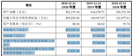 招股書顯示,2018-2020年度營收分別為66.7億元、82.43億元、83.55億元,淨利潤分別為2.76億元、3.77億元、3.91億元,扣非後淨利潤分別為2.4億元、3.17億元、3.1億元。