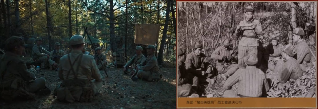 左圖為劇中班會的場景,右圖為軍博展出志願軍戰士班會歷史照片