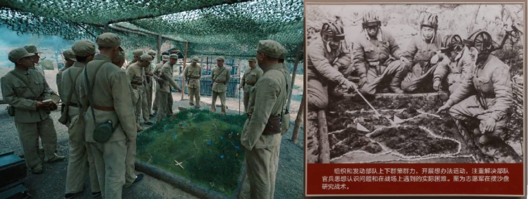 左圖為劇中戰前任務佈置,右圖為軍博展出志願軍對照沙盤研究戰術