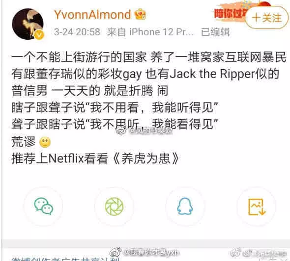 可惜,她這種抖機靈的行為並不能襯托自己的高雅,反而暴露了自己扭曲的三觀。