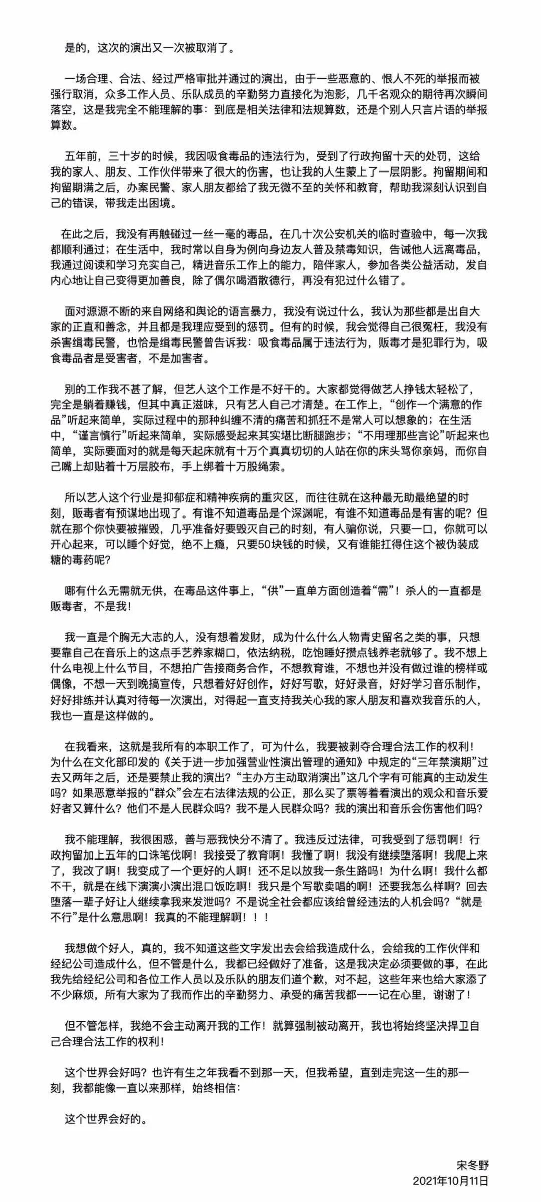 簡單來説,宋冬野説自己近期有一場安排上檔期的演唱會被投訴了,然後取消了,投訴的主要原因就是因為他前幾年吸毒被抓。