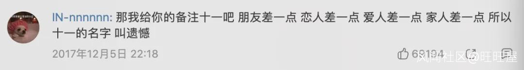 還有一條熱評説: 那我給你備註“十一”吧,朋友差一點,戀人差一點,愛人差一點,家人差一點,所以,十一的名字,叫遺憾。