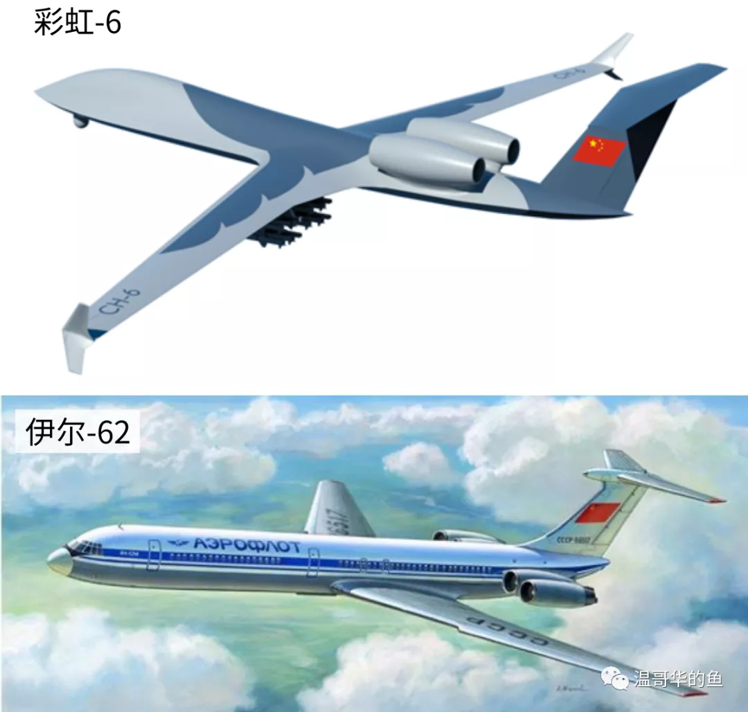 第一眼看到這張呆萌的“米老鼠”照片,很多人説想到了SR-71或者A-10,我首先想到的卻是圖-22“眼罩”轟炸機。不過除了發動機佈局外,彩虹-6的整體結構還是中規中矩的,細長的機身,小後掠角大展弦比機翼,高置T型尾,和伊爾-62有些神似。