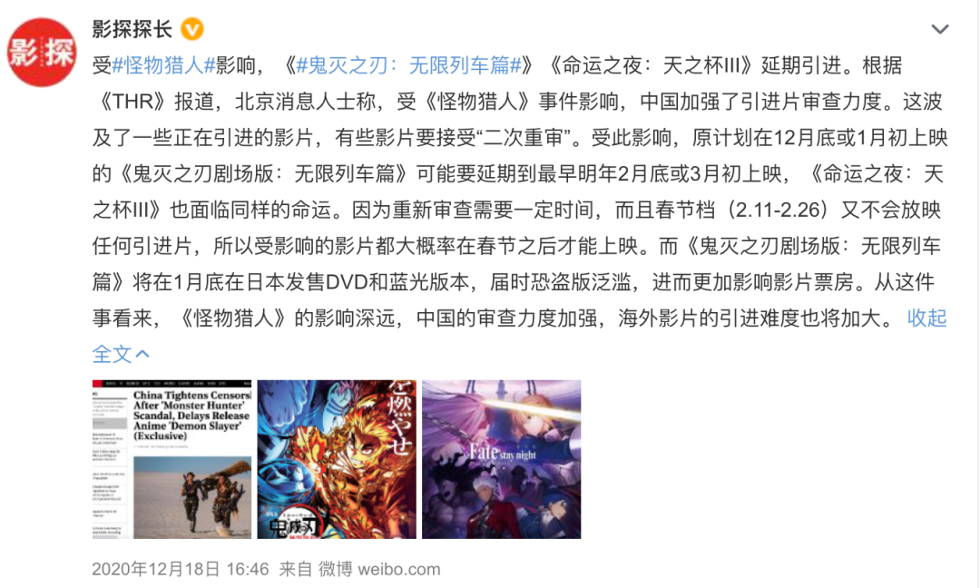 據説,受《怪物獵人》的影響,相關部門加強引進片的審查力度,一些正在引進的影片面臨回爐重審。