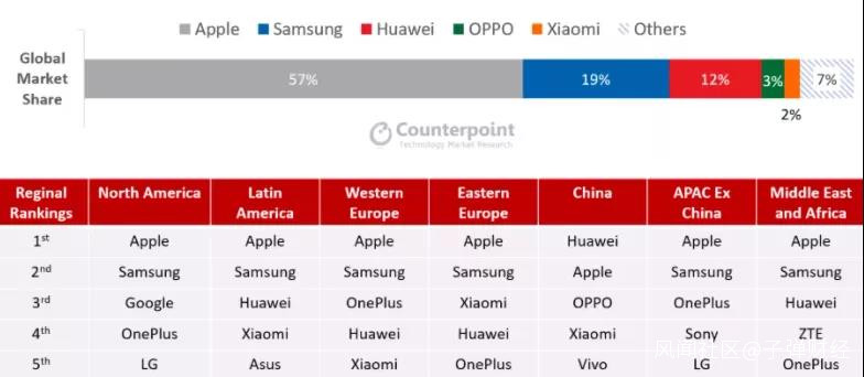 (Counterpoint統計2020年Q1全球主要高端手機市場數據)