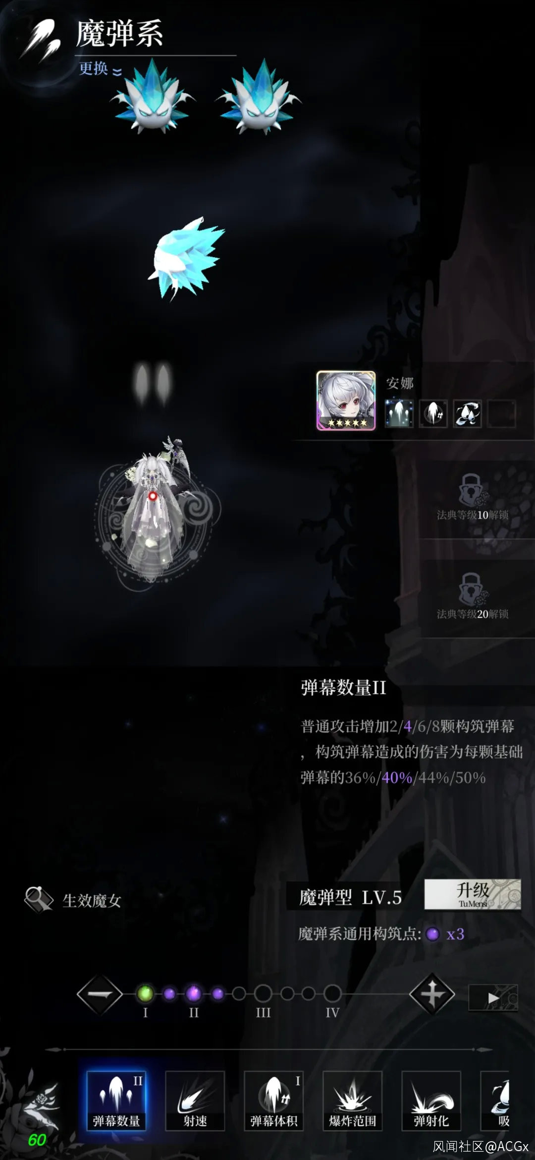 另外,為了應對不同的戰鬥場景,遊戲以6種類型彈幕為基礎設計了構築系統。每種基礎彈都有不同的構築分支,通過增減構築點數可以達成不同的彈幕效果以及基礎彈形態。比如直線彈攻擊為特點的魔彈系,就可以通過構築達到分支彈射和普攻吸血的效果;以散射彈為攻擊特點的幻棘系,則可以通過構築實現彈幕聚攏、攻擊穿透和普攻神火回覆的效果。對核心玩家來説,每種彈幕應該哪一方面的強化,他們會在逐漸的遊戲過程中摸索出自己獨特的構築玩法來。對新玩家而言,這是一種降低遊戲難度的有益嘗試。