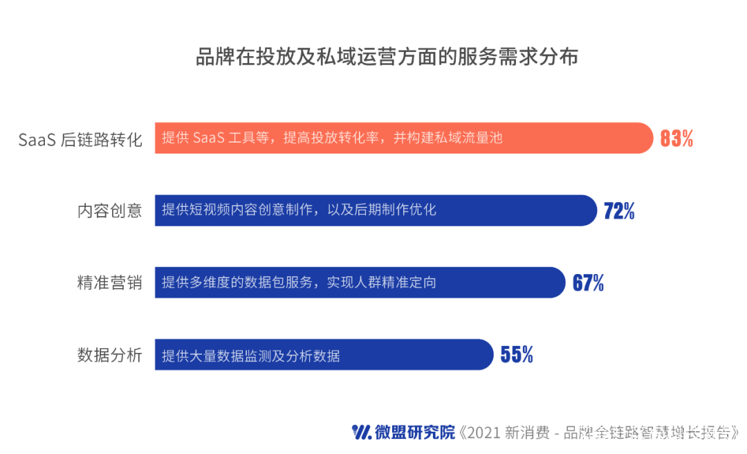 除了在公域、私域的痛點之外,新消費場景中,83%的品牌關注後鏈路營銷,希望通過SaaS工具等,提升投放轉化率,構建自有流量池。同時,50%以上的品牌對內容創意、精準營銷以及數據分析有需求。