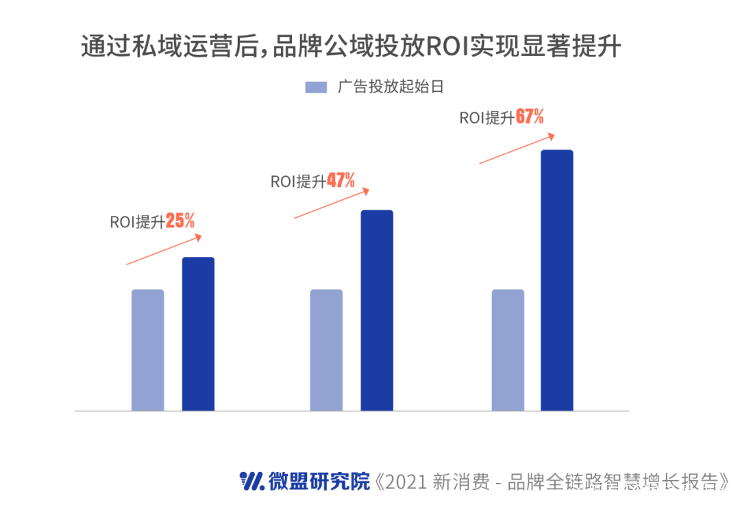 儘管這與微信生態出色的ROI有關,《微盟報告》中提到,品牌在微信生態投放廣告期間,投放ROI實現與日遞增,分別在15天提升25%、30天提升47%、60天提升67%。