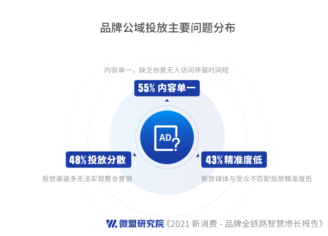 據微盟研究院問卷調查顯示,在公域投放上,主要集中在內容素材單一、投放渠道分散、投放受眾不匹配等問題。
