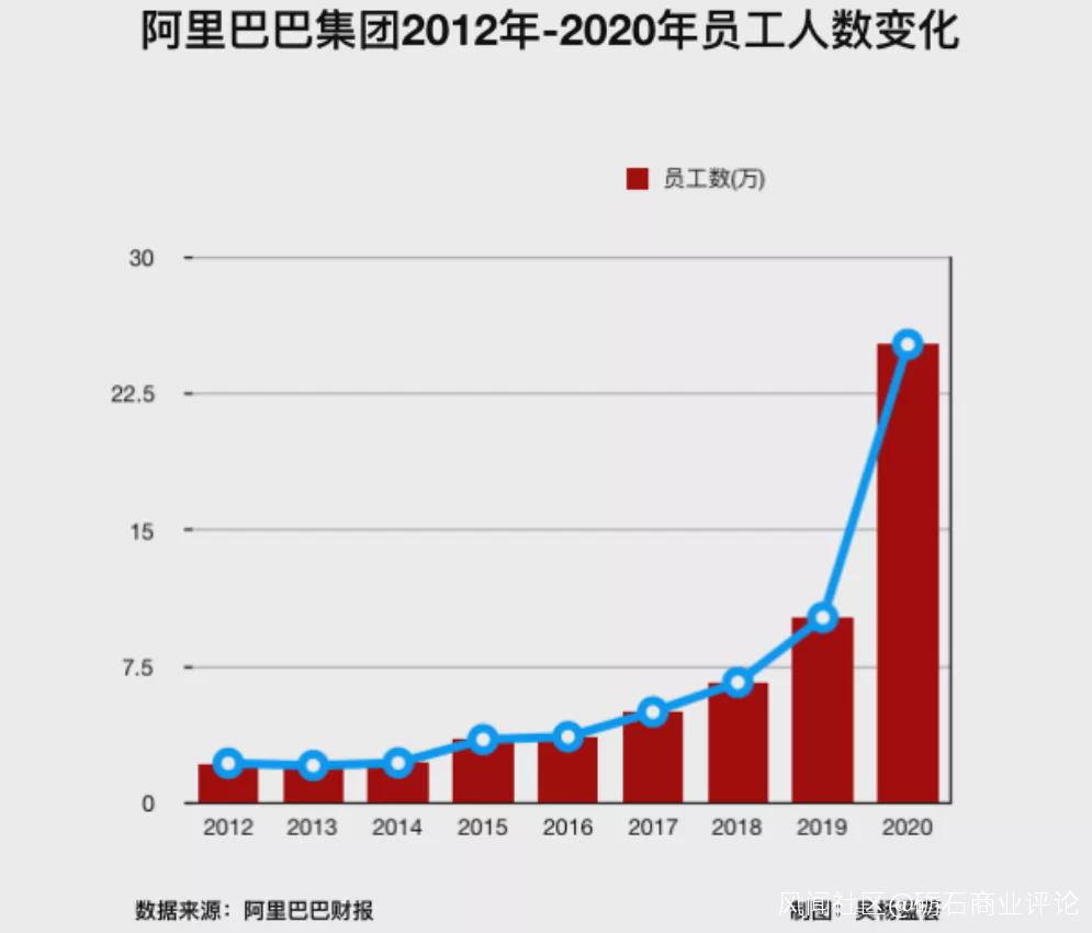 從2012年到2016年,阿里員工人數從2.2萬增長到3.6萬,4年時間累計增長了1.4萬人;但2017年一年,阿里人數就增長了1.4萬人,總員工數突破5萬。2021年,阿里集團員工人數突破25萬,再加上大潤發等阿里系公司,總人數高達40多萬。