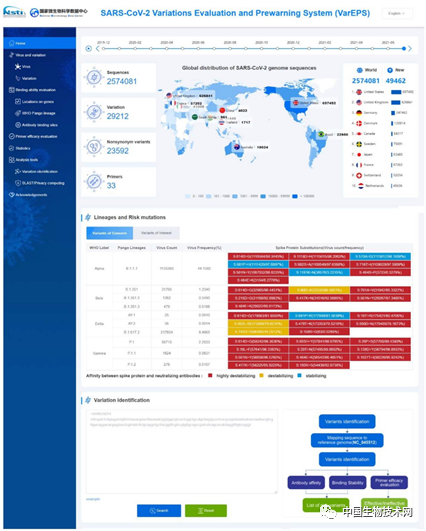 中國科學院微生物研究所微生物資源與大數據中心馬俊才團隊和胡松年團隊與北京大學、中國科學院計算機網絡信息中心等團隊合作在國際知名學術期刊Nucleic Acids Research(IF=16.971)上發佈了“新型冠狀病毒變異評估和預警系統”(SARS-CoV-2Variations Evaluation and Prewaning System),簡稱VarEPS數據庫。VarEPS是全球首個對SARS-CoV-2基因組已知變異及虛擬變異進行多維度風險評估和預警的系統。