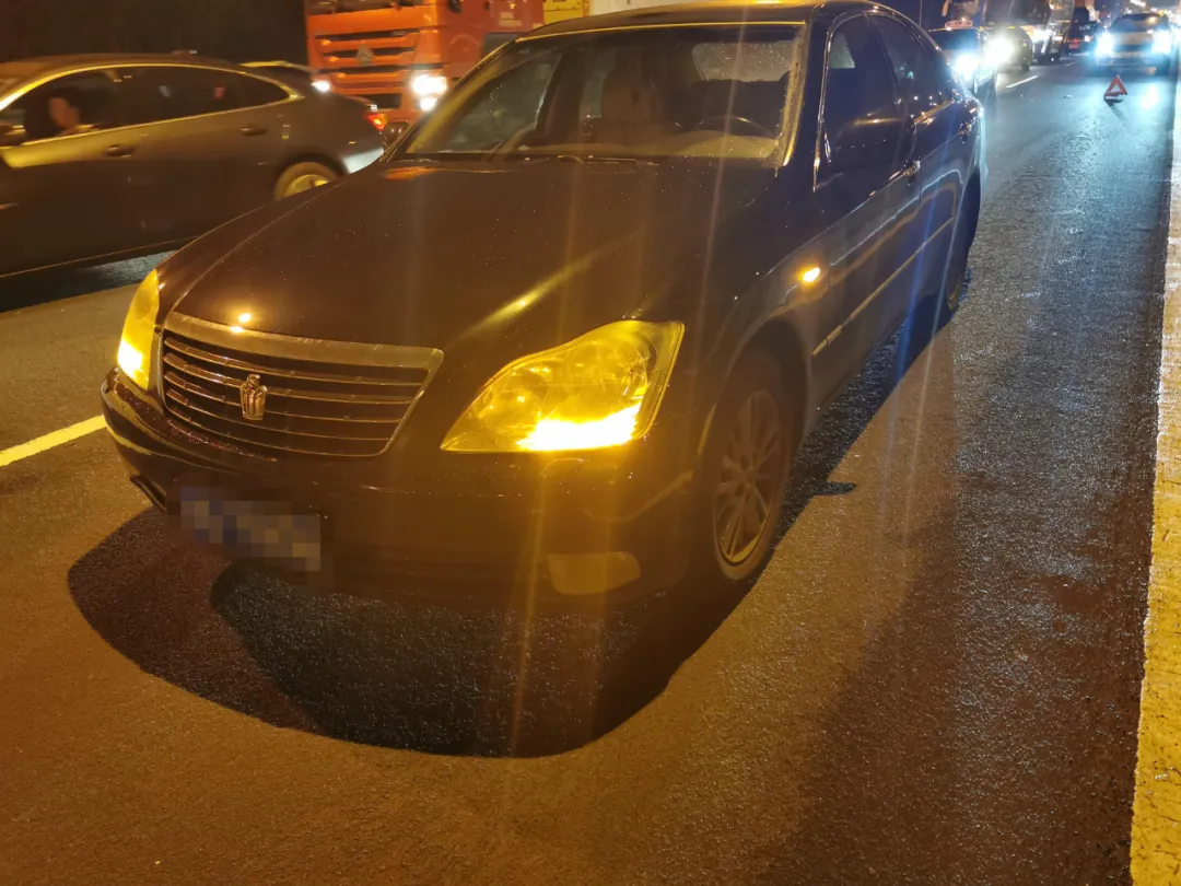 一號車,老皇冠,停在快車道上,打着雙閃,估計是拋錨了。