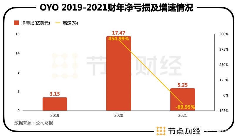 折戟中國市場疊加世界範圍內的疫情影響,OYO的發展勢頭已不復早期的高歌猛進。根據招股説明書,截至2020年3月,OYO全年虧損17億美元,在斷臂求生,砍去中國市場近90%的規模後,截至2021年3月,虧損收窄至5.25億美元。