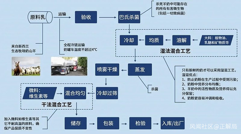 通常來説,幹法制造是基於鮮奶直接高温乾燥噴粉而成,乾濕法則是基於鮮奶和部分對温度不敏感的營養元素混合製成基粉。