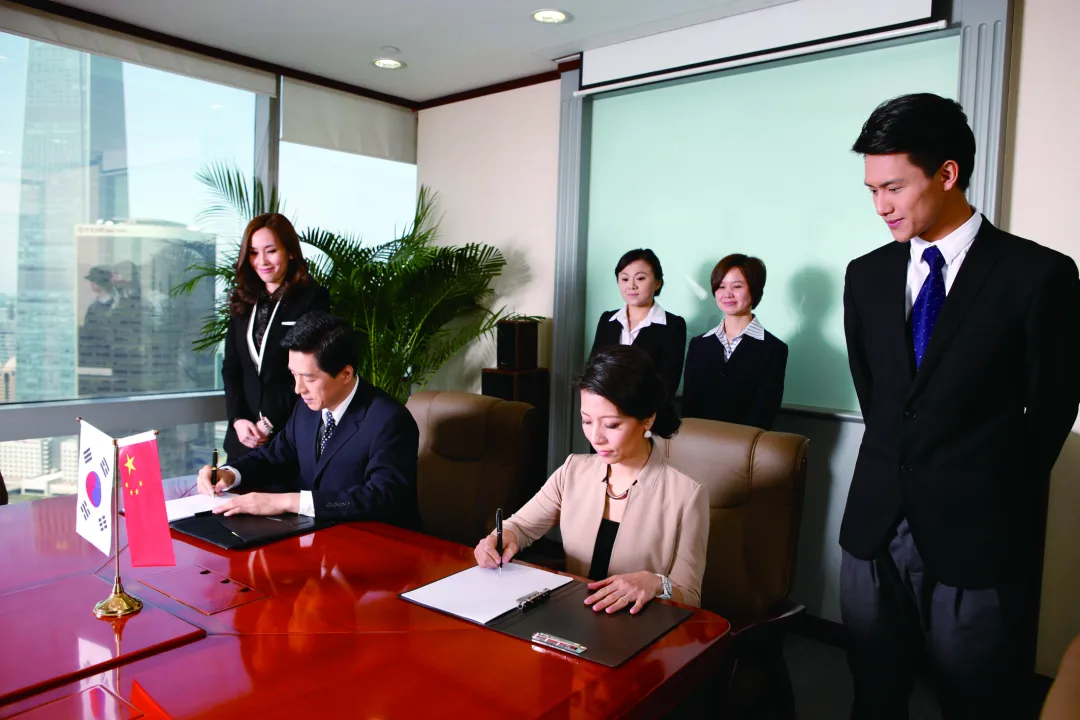 ❷ 中國公司的簽字代表張總作為主方將客方韓國公司的簽字代表耿總迎入簽字儀式現場(注意客方的座位、國旗均應在主方的右側)。