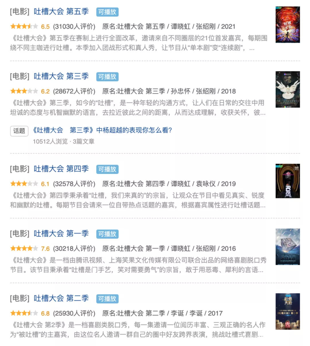 同時,《脱口秀大會》前兩季也並沒有完成出圈,只能算是引發了脱口秀的階層普及和在圈層中獲得了不小的聲量。另一檔笑果文化的節目《吐槽大會》則早早陷入了“洗白大會”的吐槽,而豆瓣評分持續下降。