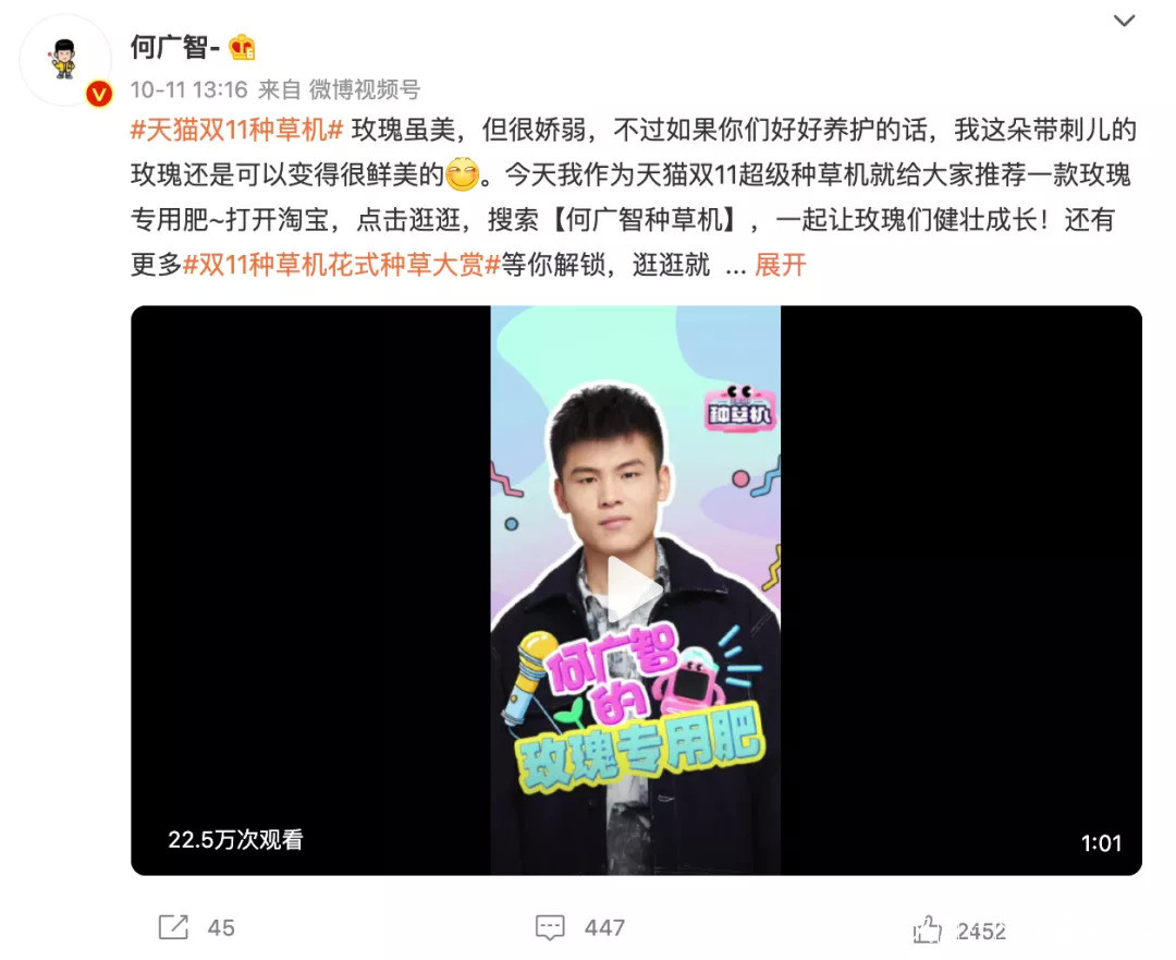 鳥鳥得到了閒魚商務;平安好車主、天貓雙11種草機的廣告出現在了何廣智的微博中……而脱口秀的線下演出也陸續開展,僅國慶期間明星演出季(國慶限定),就落地長沙、南昌、成都、重慶、杭州,售磬速度也不慢。