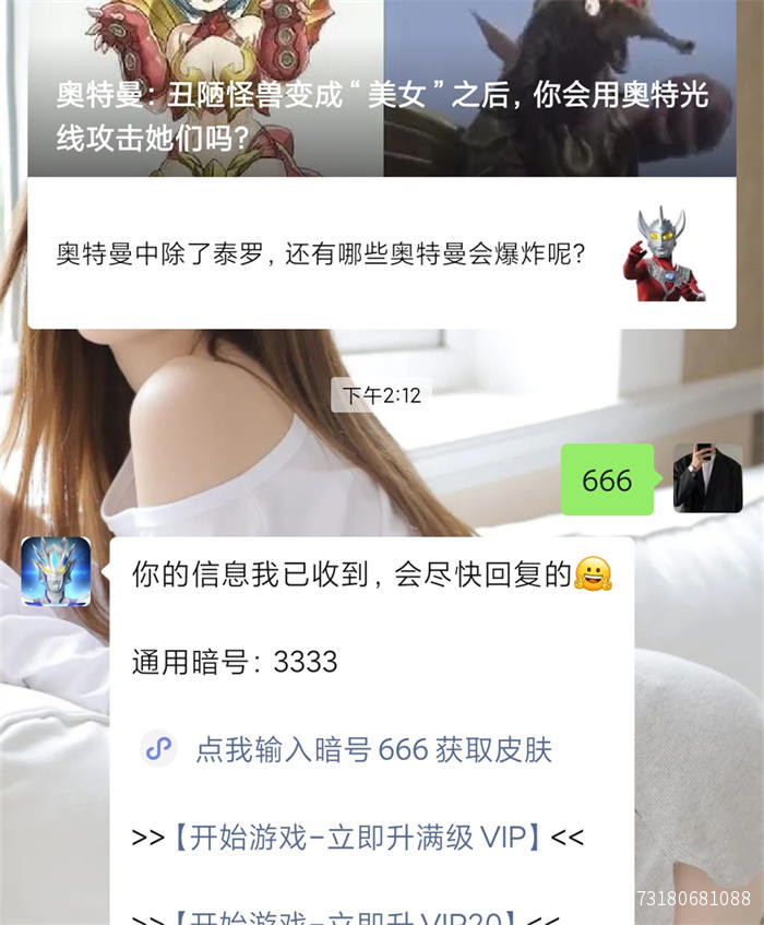 先不管這些真真假假了,只要公眾號裏面是真實的乾貨就行,結果也是從來不會讓我看到希望,該公眾號除了名字和文章是與該奧特曼遊戲相關外,其餘菜單欄和代碼入口全部是其他遊戲的鏈接,還有一部分是廣告。發現一處有留客服微信,是企業號,我趕緊加上諮詢了一下該客服微信的企業主體又是北京的,加上好友後,我先説明來意了我想要奧特曼xxx遊戲的禮包,她説幫我查詢一下還有沒有,過了幾分鐘之後,她回覆我禮包暫時沒有了,然後我就恩,只能作罷,可是又過了幾分鐘,她終於開始了她真正的工作內容了,開始向我推廣遊戲了,如下圖