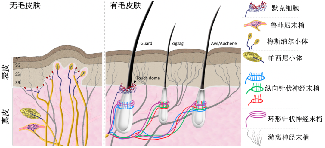以最大的器官——皮膚為例,背根神經節(DRG)的神經纖維分佈到皮下,特化成各類機械感受器。輕觸覺感受器需要響應較小的力,是低閾值機械感受器(LTMRs),主要有無毛皮膚(例如手掌)中的特殊細胞(默克細胞Merkel cells)和各類神經末梢小體(魯菲尼末梢Ruffini ending、梅斯納爾小體Meissner corpuscle和帕西尼小體Pacinian’s corpuscle)以及有毛皮膚(例如手背)中的特殊細胞(默克細胞Merkel cells)和環繞毛囊的各類縱向和環形針狀的低閾值機械感受器。而痛覺感受器往往響應較大的傷害性機械刺激,是高閾值機械感受器(HTMRs)。在皮膚中,它們一般以自由神經末梢的方式存在[25, 26]。本體感覺的感受器最主要分佈在肌肉組織中,主要包括肌梭和肌腱中的本體感覺感受器。它們能感受肌肉的牽張,繼而反饋四肢方位和軀體平衡的信息[27]。