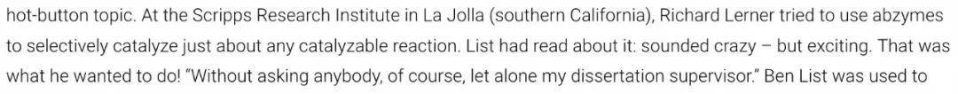 裏面很明確地寫了,他1997-1998年間在Scripps做博士後,1999-2003年間在Scripps擔任助理教授。前面論文截圖裏能看到,論文投稿日期是1999年12月7日,説明投稿時,List已經獨立了將近一年,是以獨立PI身份完成獲獎工作的。當然不排除他從博士後期間就開始做獲獎工作,但如果是那樣的話,他的博士後導師至少也得是個共同通訊作者,不符合論文署名情況。(有報道説List在做博士後期間產生了獲獎工作的想法,這種可能性當然是存在的,但跟諾貝爾獎歸屬問題無關。)List獲獎後,馬普所網站上有一篇對他的報道《A Perspective for Life》,網址是https://www.mpg.de/17662734/potrait-benjamin-list這篇報道里包含更多List生平的信息。報道中沒有一處提到Barbas,但兩次提到Lerner,截圖如下: