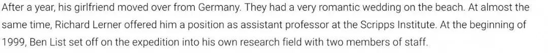 裏面很明確地寫了,他1997-1998年間在Scripps做博士後,1999-2003年間在Scripps擔任助理教授。前面論文截圖裏能看到,論文投稿日期是1999年12月7日,説明投稿時,List已經獨立了將近一年,是以獨立PI身份完成獲獎工作的。當然不排除他從博士後期間就開始做獲獎工作,但如果是那樣的話,他的博士後導師至少也得是個共同通訊作者,不符合論文署名情況。(有報道説List在做博士後期間產生了獲獎工作的想法,這種可能性當然是存在的,但跟諾貝爾獎歸屬問題無關。)List獲獎後,馬普所網站上有一篇對他的報道《A Perspective for Life》,網址是https://www.mpg.de/17662734/potrait-benjamin-list這篇報道里包含更多List生平的信息。報道中沒有一處提到Barbas,但兩次提到Lerner,截圖如下: