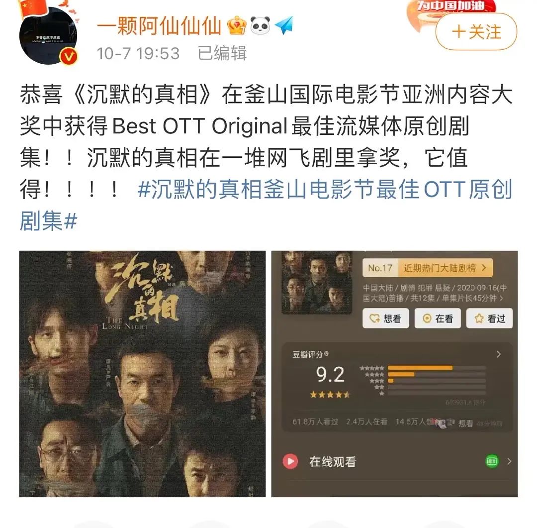 前些天剛舉行的2020年釜山電影節,愛奇藝的《沉默的真相》從一眾網飛劇中殺出,奪得了「最佳流媒體原創劇集」獎項。