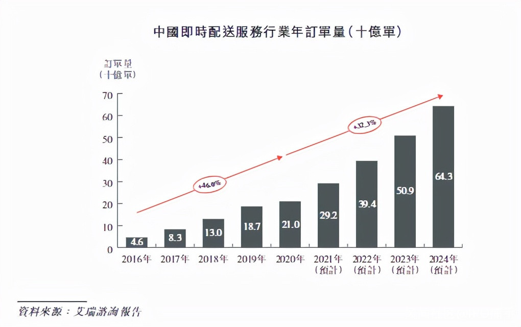 實時配送服務行業的年訂單量從2016年的46億單增至2020年的210億單,複合年增長率為46.0%。考慮到新服務場景的不斷擴展及新業態模式與消費模式的創新,實時配送服務行業具有明顯的增長潛力。預計2024年中國實時配送服務行業的年訂單量將進一步增至643億單,2020年至2024年複合年增長率為32.3%。