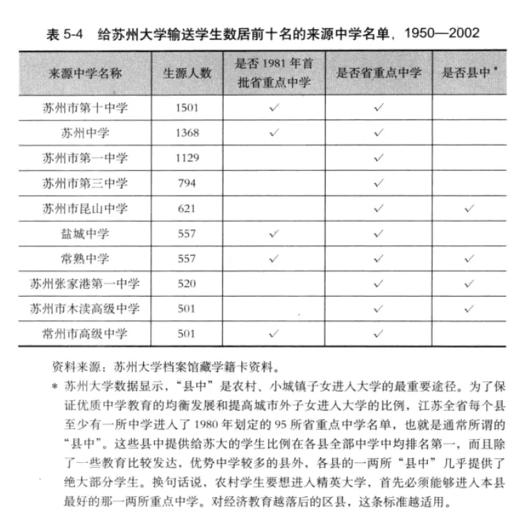 計算北京大學與蘇州大學兩校學生來源中學後發現,精英大學生源高度集中於少數重點中學,特別是省級重點中學。所謂重點中學,可以理解為各地方政府與教育部門優先發展、大力扶持建設的學校。中共自延安時期就有各類重點校的設置,1949年以後,除了“文革”期間,重點學校始終以不同形式存在並得到了發展壯大。重點中學在經費、師資配置和招生權限上都享受着政府給予的遠優於普通中學的政策,而他們自身也總以向大學特別是重點大學或精英大學輸送更高比例的畢業生為己任。由此,他們常常能夠壟斷某一地區大學升學名額。如下文將展示的,北大、蘇大兩校學生絕大部分來自重點中學,北大的絕大多數學生更是來自省級重點中學。這合乎社會大眾的一般認知,即大學越精英,學生來源中學也越精英。因此,儘管看起來精英大學是實現社會流動或再生產的重要機制,實際上精英中學的作用絲毫不遜色於大學,尤其在地方社會,精英中學才是整個社會階層能否流動的關鍵。重點中學在一個地區內部的數量、分佈和開放程度將直接決定整個地區人口獲取精英教育的水平和走向;而對於學生個人來説,能否進入重點中學,尤其是省重點中學,也會在很大程度上決定其能夠進入怎樣的精英大學。