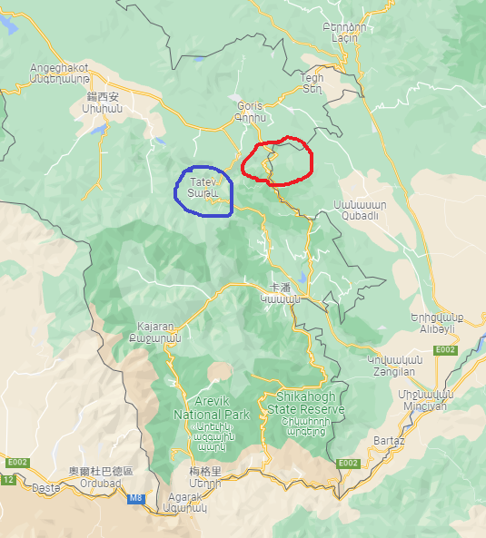 ● 卡潘到戈里斯的道路有20公里(紅圈處)經過納卡地區,而另一條亞國境內經過Tatev(藍圈)的道路途徑複雜山區,路況曲折惡劣,大貨車無法通行 / 網頁截圖