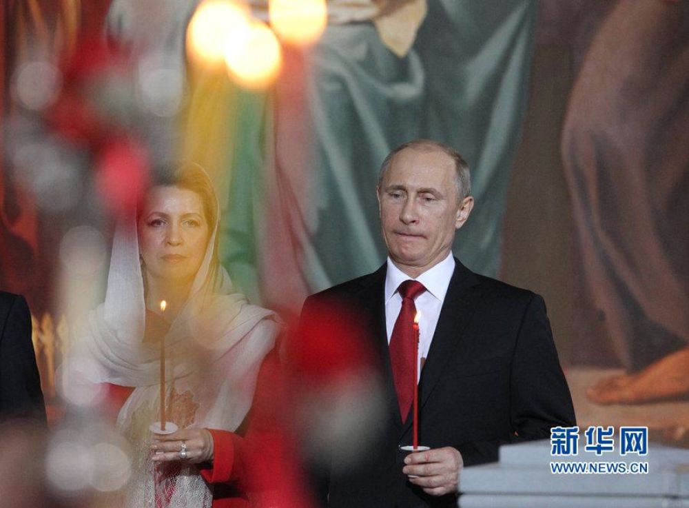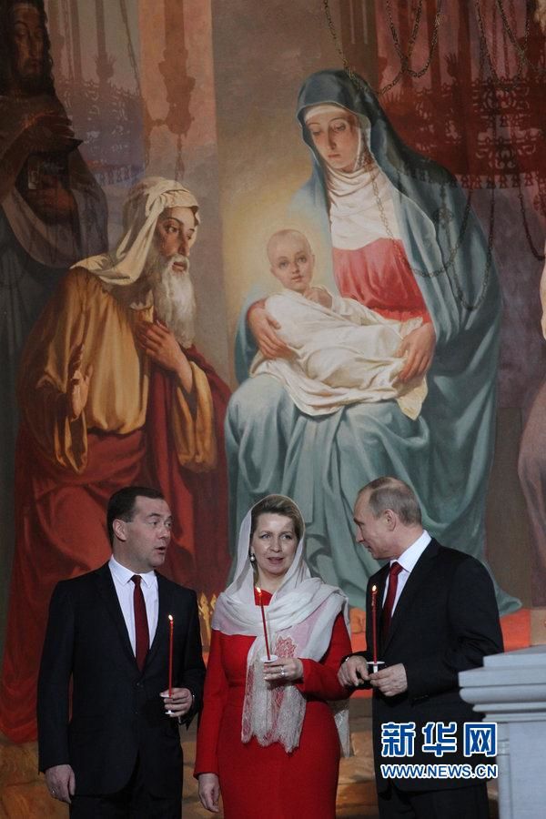 當地時間2014年4月20日凌晨,俄羅斯莫斯科,復活節宗教儀式在耶穌救世主大教堂舉行,俄總統普京、總理梅德韋傑夫以及總理夫人斯韋特蘭娜出席儀式。