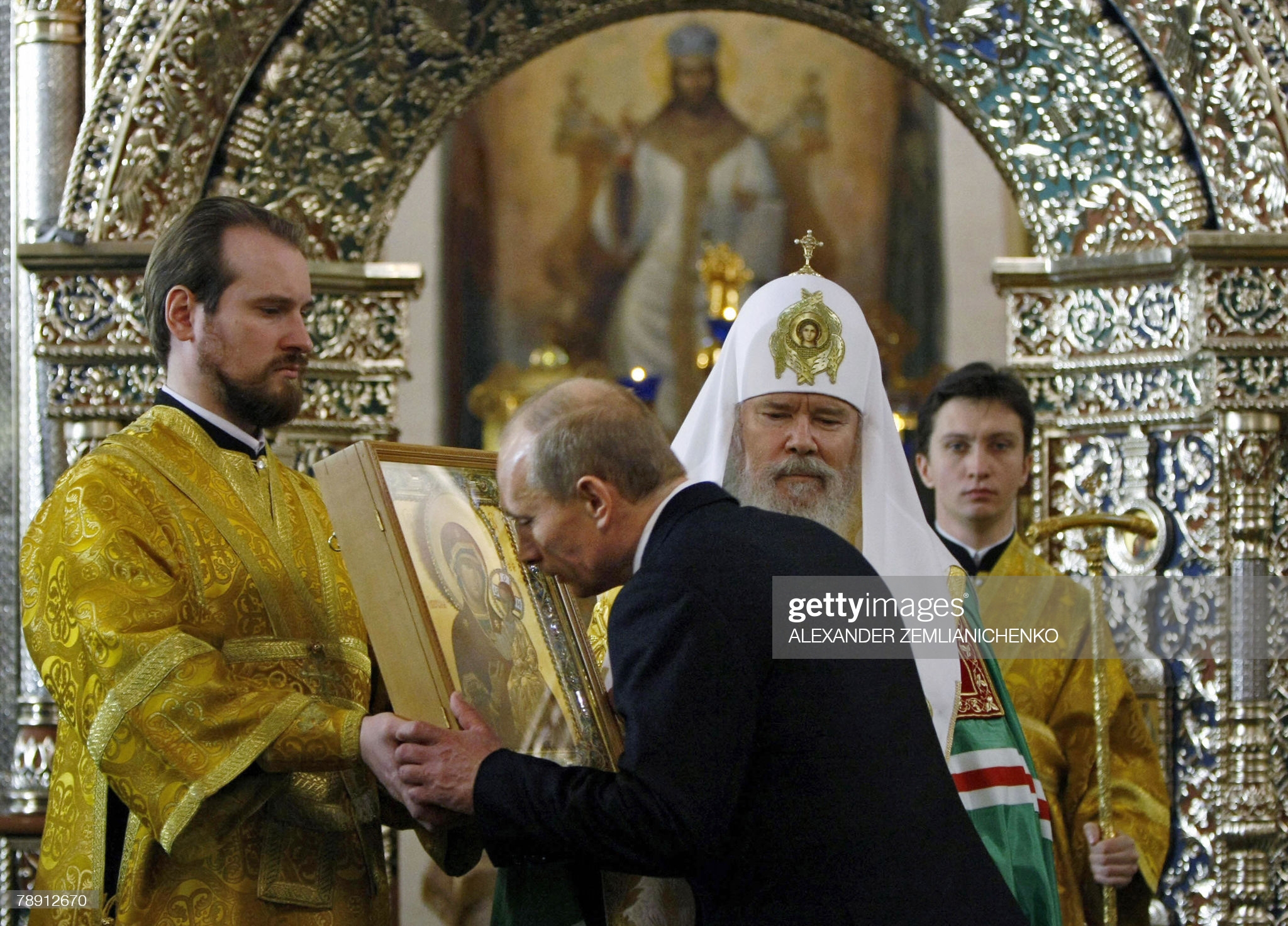 下圖為2008年1月12日,普京在莫斯科西北部約380公里(236英里)的瓦爾代湖畔建於17世紀的Iversky修道院的烏斯別斯基大教堂(聖母昇天教堂)裏,親吻了聖母像: