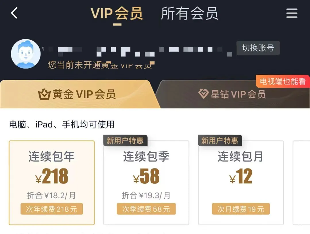愛奇藝:連續包月12元、連續包季58元、連續包年218