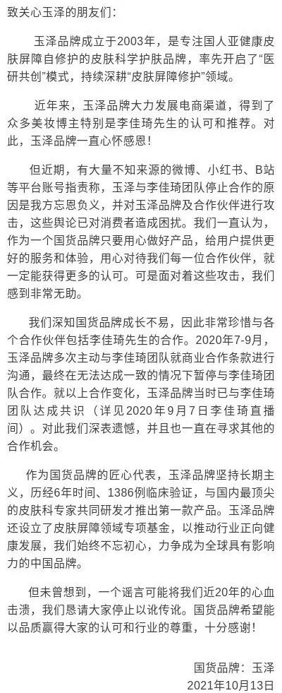 玉澤在這則聲明中表示,近期有大量不知來源的微博、小紅書、B站等賬號,指責玉澤與李佳琦團隊停止合作的原因是玉澤“忘恩負義”,並對玉澤品牌進行攻擊,為此玉澤“感到非常無助”,懇請網友停止“以訛傳訛”。