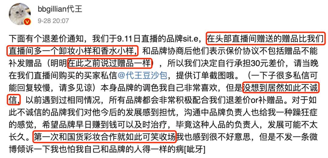 淘寶主播“代王”就自稱遭遇了不公平對待。今年9月,代王發微博稱,在提前溝通過“贈品與薇婭李佳琦直播間一致”的前提下,合作品牌還是在頭部主播的直播間多贈送了一些小樣”,品牌還表示不能補發贈品,主播只能自行承擔差價。