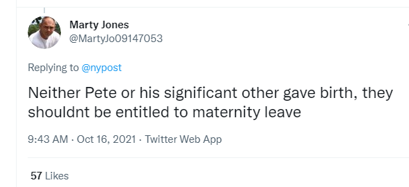 有推特網友認為,布蒂吉格和他的另一半都沒有進行生產,不應該享受產假。