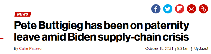 絕了……就在拜登政府面臨供應鏈危機,美國港口一團糟,沒法卸貨之際,美國交通部長皮特·布蒂吉格(Pete Buttigieg)在休陪產假,而且已經休了快兩個月。