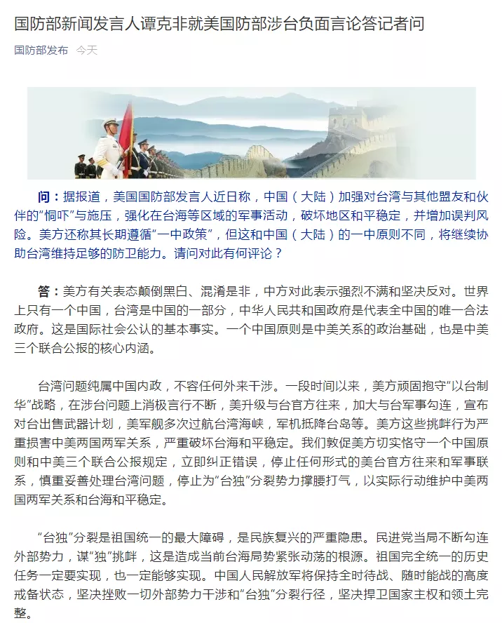 國防部新聞發言人譚克非就美國防部涉台負面言論答記者問,全文如下: