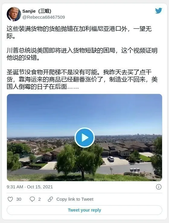 華人網友説:這些裝滿貨物的貨船拋錨在加利福尼亞港口外,一望無際。靠海運來的商品已經翻番漲價。