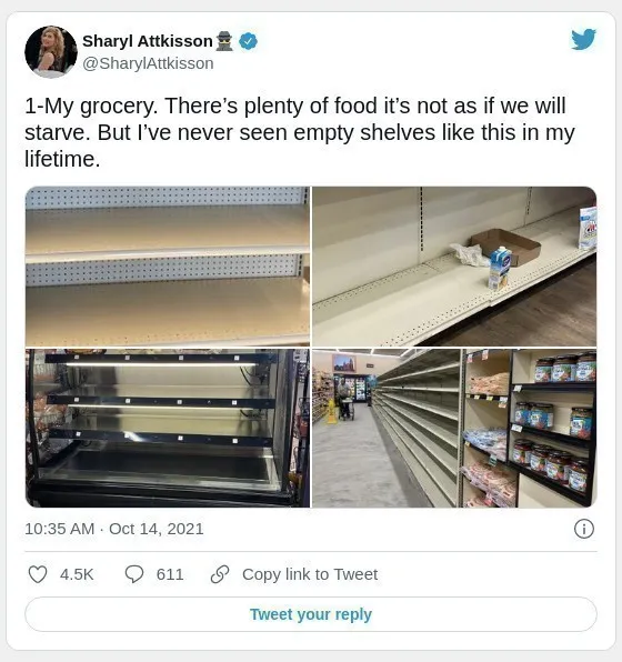 華盛頓特區的 Full Measure News 的記者 Sharyl Attkisson 在推特上發佈了一張空貨架的照片,並指出:“我的雜貨店。有很多食物,好像我們不會餓死一樣。但我一生中從未見過這樣的空架子。