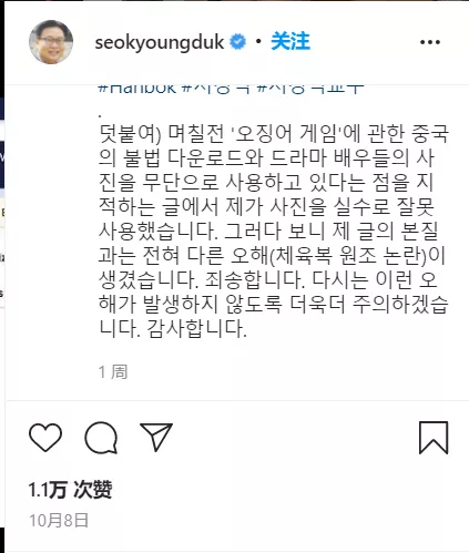先來看看這位教授道歉的“誠意”:就在同一條“道歉”貼文的前半段,徐炯德還在談論“韓服”的話題。