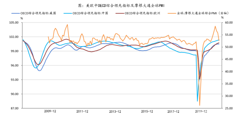 從整個經濟週期來看,當前美歐中經濟都存在高位見頂壓力。8月摩根大通全球綜合PMI收於52.60%,前值55.80%,連續三個月出現高位回落。8月美歐中OECD綜合領先指標100.48、100.76、101.39,雖然未見拐點,但已至週期高位。