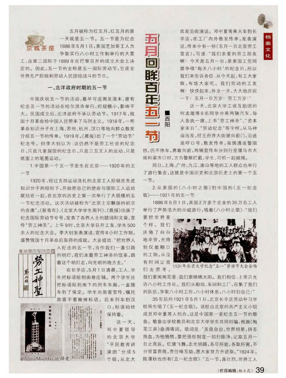 標題:五月回眸百年五一節;轉自一份名叫《北京檔案》的雜誌2013年的第5期。該雜誌是北京市檔案局和北京市檔案學會共同主辦的。