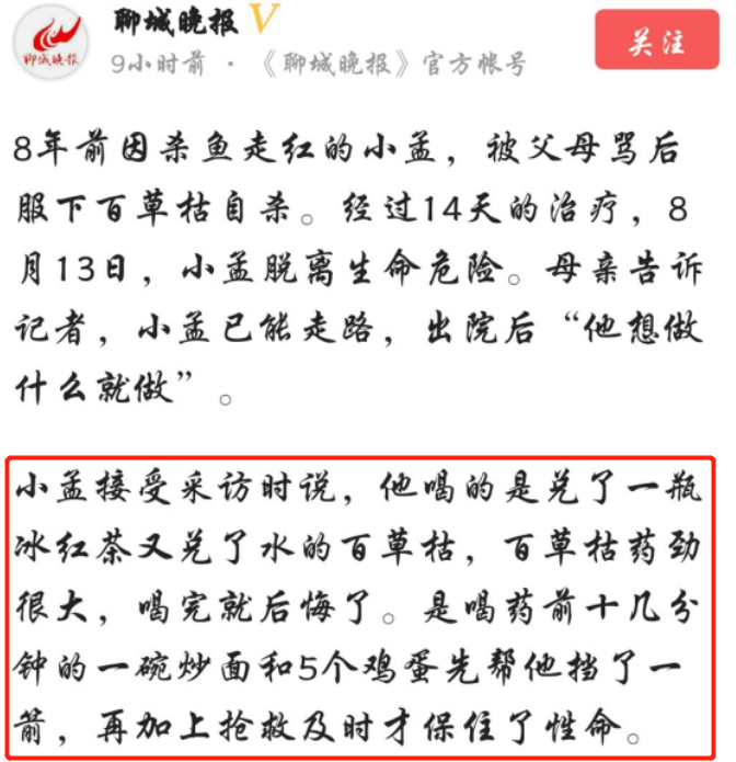 在最近幾年服用百草枯自殺的案例中,有一個被成功救回的典型案例,——“殺魚弟”。