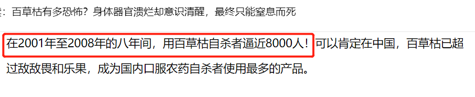 百草枯似乎是一種“流行”的自殺手段。有報道稱,2001年至2008年,用百草枯自殺者近8000人。