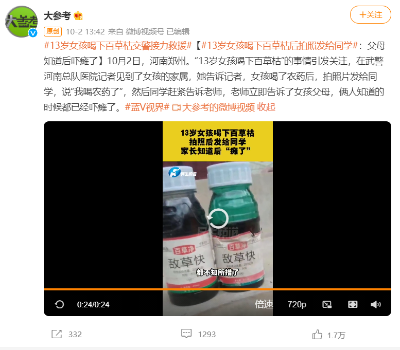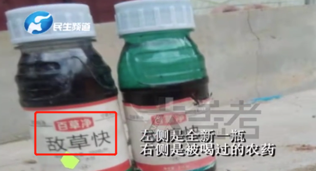 這則新聞剛被報道時,曾有網友指出新聞視頻中提供的藥瓶並不是百草枯,而是敵草快。