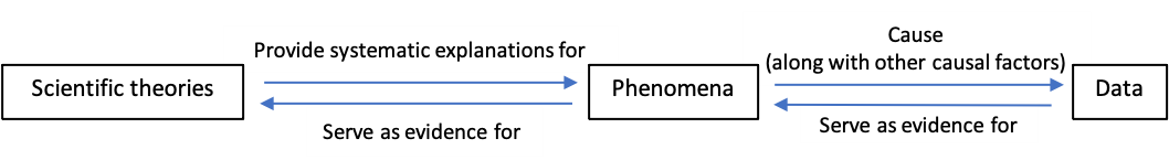 波根與伍德沃德認為,數據和現象在科學研究中所發揮的作用是不同的。按照他們的觀點,數據、現象與科學理論的關係可以總結如下(參考圖1):