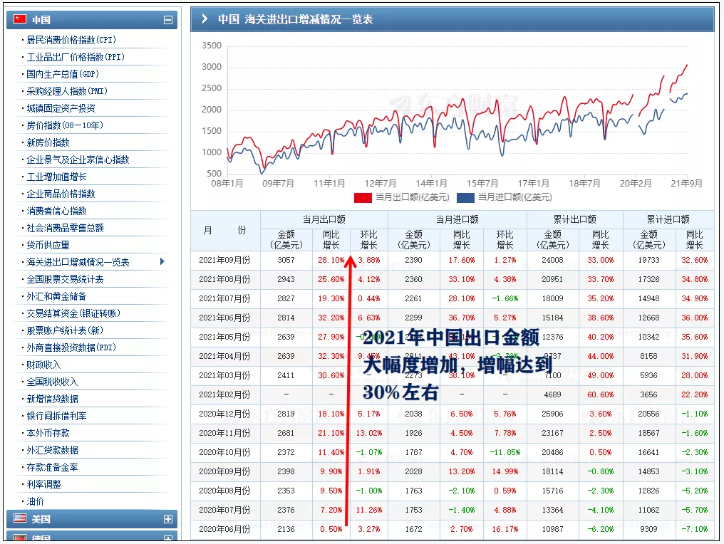 我們立刻可以看到,自從進入2021年,中國出口金額大幅度的增加,增幅達到30%左右,所以電力不足的原因一下子就出來——有這些數據支撐,不需要你猜來猜去的。