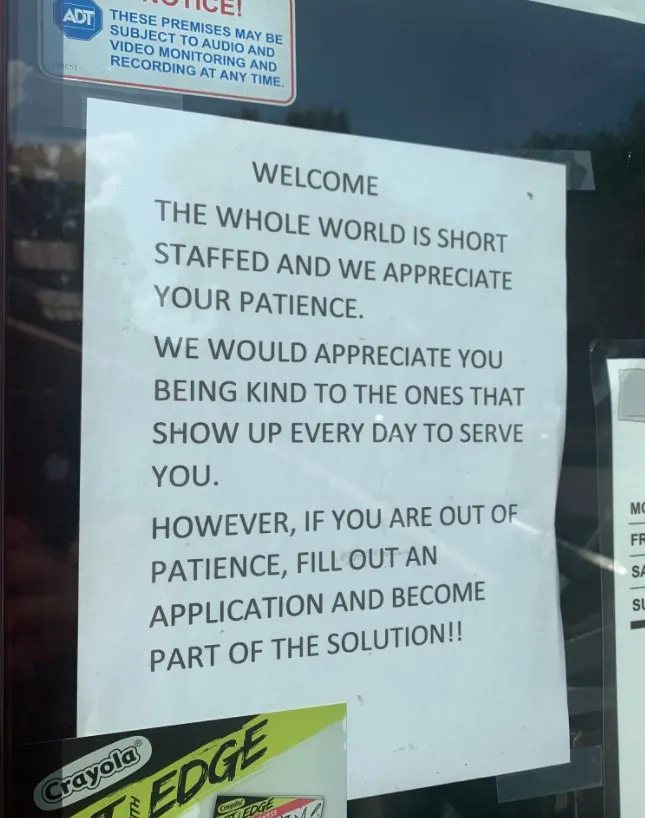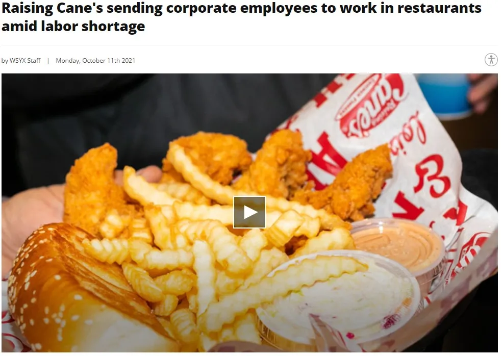 餐飲業也是受衝擊的行業之一。因為太缺人手,餐館們為了招人絞盡腦汁。Raising Cane 甚至不得不把總公司的員工下派到各個分店去支援: